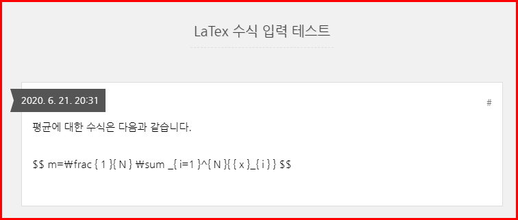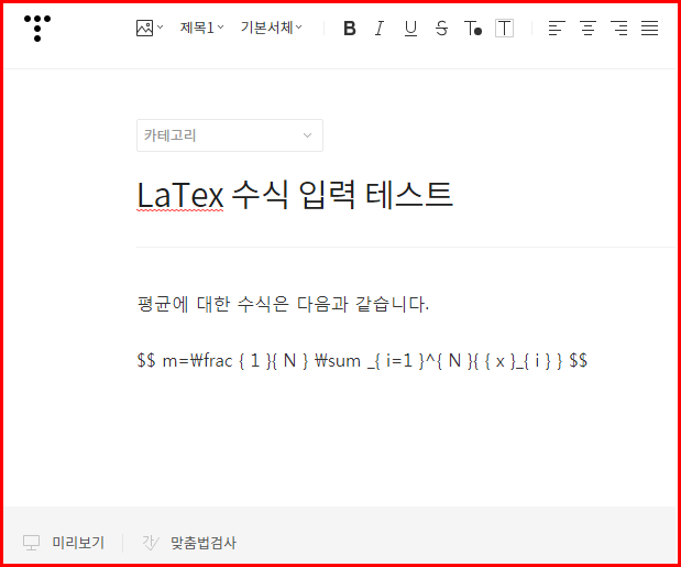 위에서 처럼 제대로 $$ 사이에 수식을 제대로 입력한 것 같은데, 미리보기로 보면 수식으로 변환되지 않고, 실제 저장해서 브라우저에서 봐도 수식으로 변환되지 않는 경우입니다.