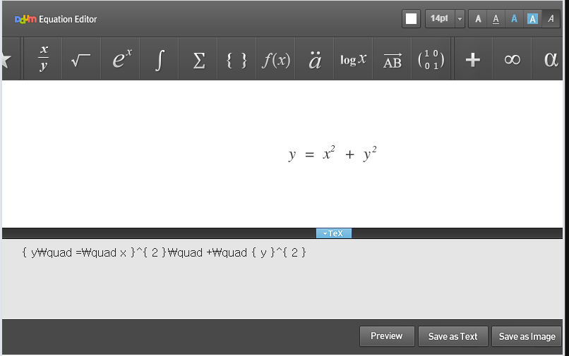 예를 들어, ${ y\quad =\quad x }^{ 2 }\quad +\quad { y }^{ 2 }$ 수식을 'Daum Equation Editor' 페이지에서 만든 후, 티스토리 블로그에 집어넣어보겠습니다.