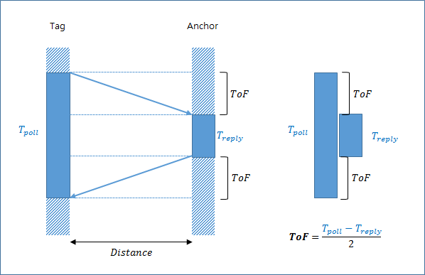 만약 태그가 전파를 폴링 하고(주기적으로 신호를 쏘는 것을 말함), 앵커가 그 폴링 전파를 받은 후 응답을 한다면, 태그가 전파를 쏘고 응답을 받을 때까지의 시간 차 $T_{poll}$과 앵커에서 신호를 받고 응답할 때까지의 시간 차인 $T_{reply}$를 빼면, 2개의 ToF 시간이 되고, 이 2 개의 ToF에 해당하는 값을 2로 나누면 ToF가 계산될 수 있습니다. (아래 그림 참조)