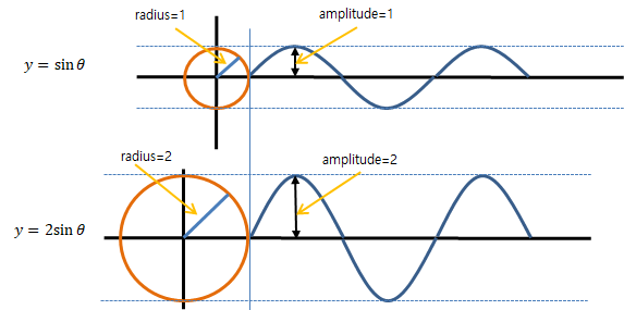원의 반지름이 1이면 진폭이 1이고, 원이 반지름이 커지면 진폭이 증가하고, 반지름이 작아지면 진폭도 감소한다.