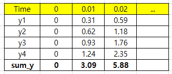 아래 테이블에서 보듯이, 각 파형의 값들을 시간 순서에 따라 각각 합치면, 전부 더해진 값을 가지는 파형이 생성되는 것은 당연하다. 즉, 진폭만이 바뀐 파형이 생성된다.