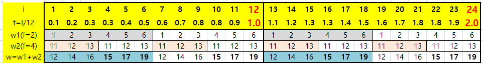 $\frac {1}{12}$초마다의 시간 간격으로 본다면, $w_1 = {1,2,3,4,56, 1,2,3,4,5,6}$과 같은 값을 가지게 된다. ($\frac {1}{12}$초 간격으로 한 것은, 주파수 2와 4를 표현할 때, 1초의 값이 정수가 되게 하기 위함이다. 4의 배수이면 되기에 1/4, 1/8, 1/12, 1/15 등의 값을 쓸 수 있다. 여기서는 1/12를 사용했다. )