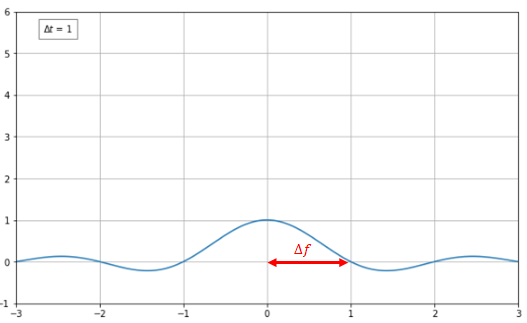 $\Delta t$의 값이 커질수록 $\Delta f$의 값이 작아지고, $\Delta t \rightarrow \infty$일 때는 $\Delta f \rightarrow 0$이 된다. 반대로 $\Delta t \rightarrow 0$이면 $\Delta f \rightarrow \infty$가 될 것이다.