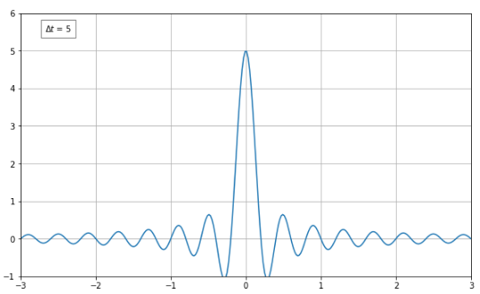 $\Delta t$의 값이 $1$일 때는 주파수가 0인 부분에서 좀 크긴하지만, 주파수가 0인 부분에서만 값이 존재할 것이라는 우리의 기대와는 다른 값이다. (우리는 처음부터 주파수가 0인 지점에서만 값이 존재할 것이라고 예상했었다.)