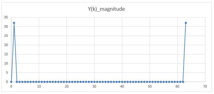 위 그림 중 Y(k)_magnitude에 대한 그래프를 보면, k=1일 때 값이 크게 나타남을 볼 수 있다. 즉, 실제 신호에서의 $\frac{1}{64}Hz$에서의 값이 가장 큰 것이고, 이 신호는 주파수가 $\frac{1}{64}Hz$인 신호임을 유추할 수 있다.