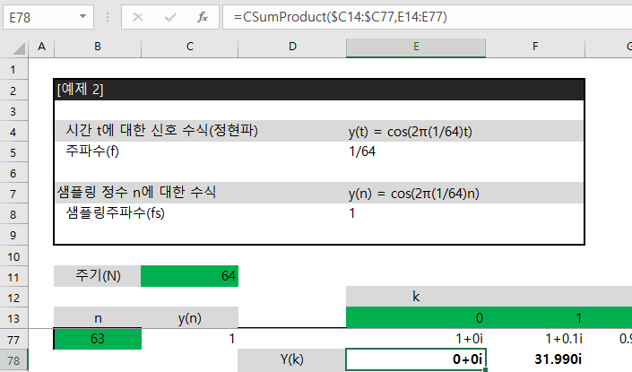 이 예제에 대한 엑셀은, 이 페이지 하단부에 첨부된 "DFT예제_2.xlsm"의 Sheet "2"에서 확인할 수 있음