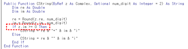 - 따라서 CString = re & "" & im & "i" 루틴으로 가게되고, 이것은 31.99 & "" & 0 & "i" = 31.99i 가 되어, 이상하게 변하게 됨. 즉, 원래는 "31.99 + 0i" 인데, 이상하게 표출되는 것