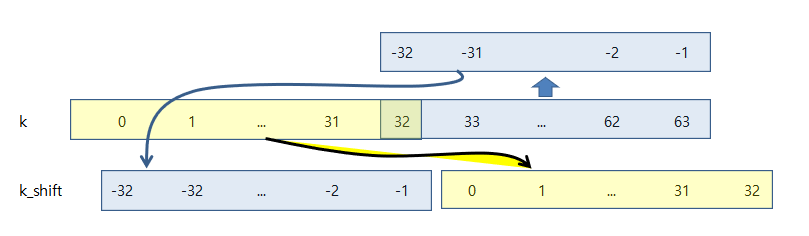 즉, 0을 중심으로해서 오른편으로는 k=32까지의 값을 그대로 표현하고, 왼쪽으로 -1은 원래 k=63의 값을, -2는 k=62의 값으로해서 -32는 원래 k=32의 값을 표현하는 것.