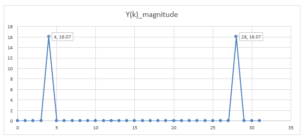 따라서, k=4일 때의 값 Y[4]은 $4\cdot\frac{1}{32}\cdot 8kHz=1kHz$일때의 DFT 값을 의미한다. 즉, 이 파형은 1kHz 주파수를 가지는 파형이라고 잘 해석이 되었다.