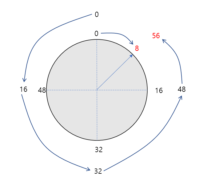 64를 주기로 갖는 원이다. 시계방향으로의 8의 위치는, 반시계방향으로는 56의 값과 같다.