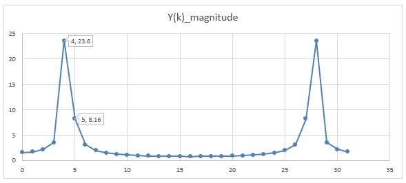 Y(k)_magnitude에 대해 그래프를 그려보면, Y(4)에 대한 값이 크고, Y(5)의 값도 조금 크게 그려진다.