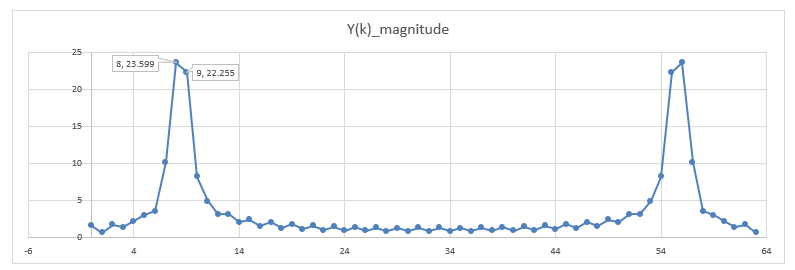 위 그래프와 같이 y[32]~y[63]까지의 값을 0으로 처리하고, DFT를 수행해서 Y(k)를 구해보면, 아래 그래프와 같이 Y[8]과 Y[9]에서 큰 값을 보이고 있어서, N=32로 했을 때 보다 더 원래의 신호값에 유사한 특성을 보여준다.