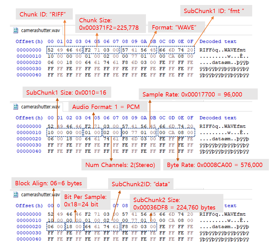 실제 WAV 파일을 바이너리 편집기를 이용해서 오픈 후, 각 데이터를 WAV 파일 포맷과 비교하면서 살펴보자.