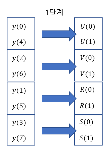 먼저 P에 대해서는, 짝수항에 의한 FFT값인 U와, 홀수항에 의한 FFT값인 V에 의해서 구해진다. 여기서 짝수항은 (그림 3)에서 노란색을 칠한 값들이다. 따라서, U값을 구할 때 사용된 y(n)값은 {y(0), y(4)}가 되고, V값을 구하는데 사용되는 y(n)값은 {y(2), y(6)}이 된다. 마찬가지 원리로 R과 S를 구할 때 사용되는 y(n)값을 구할 수 있고, 이를 개념도에 표시해보면 아래와 같다.