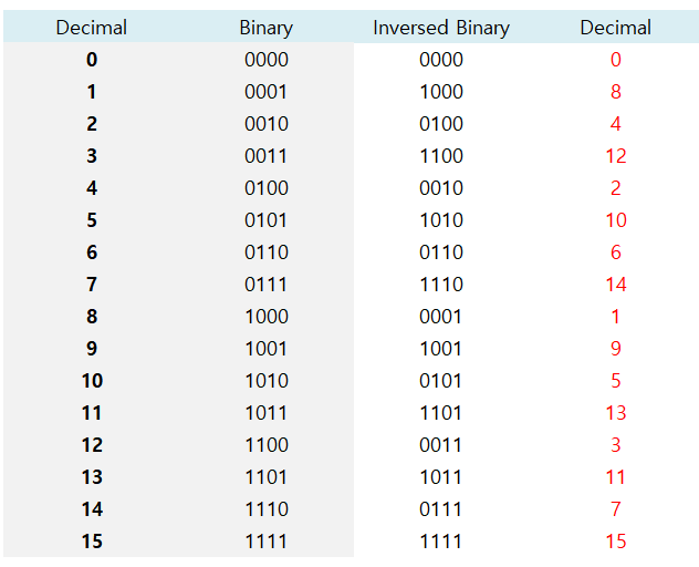 y(n) 데이터의 이러한 순서를 알아내는 것은, 순서를 나타내는 값을 이진수로 나타낸 후, 그 이진수의 값을 뒤집은 상태에서 정렬하면, 신기하게도 이러한 순서대로 된다.