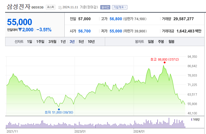 '24년 11월 11일 기준 삼성전자의 주가는 55,000으로 약 2년 내 최저가를 기록하고 있다.