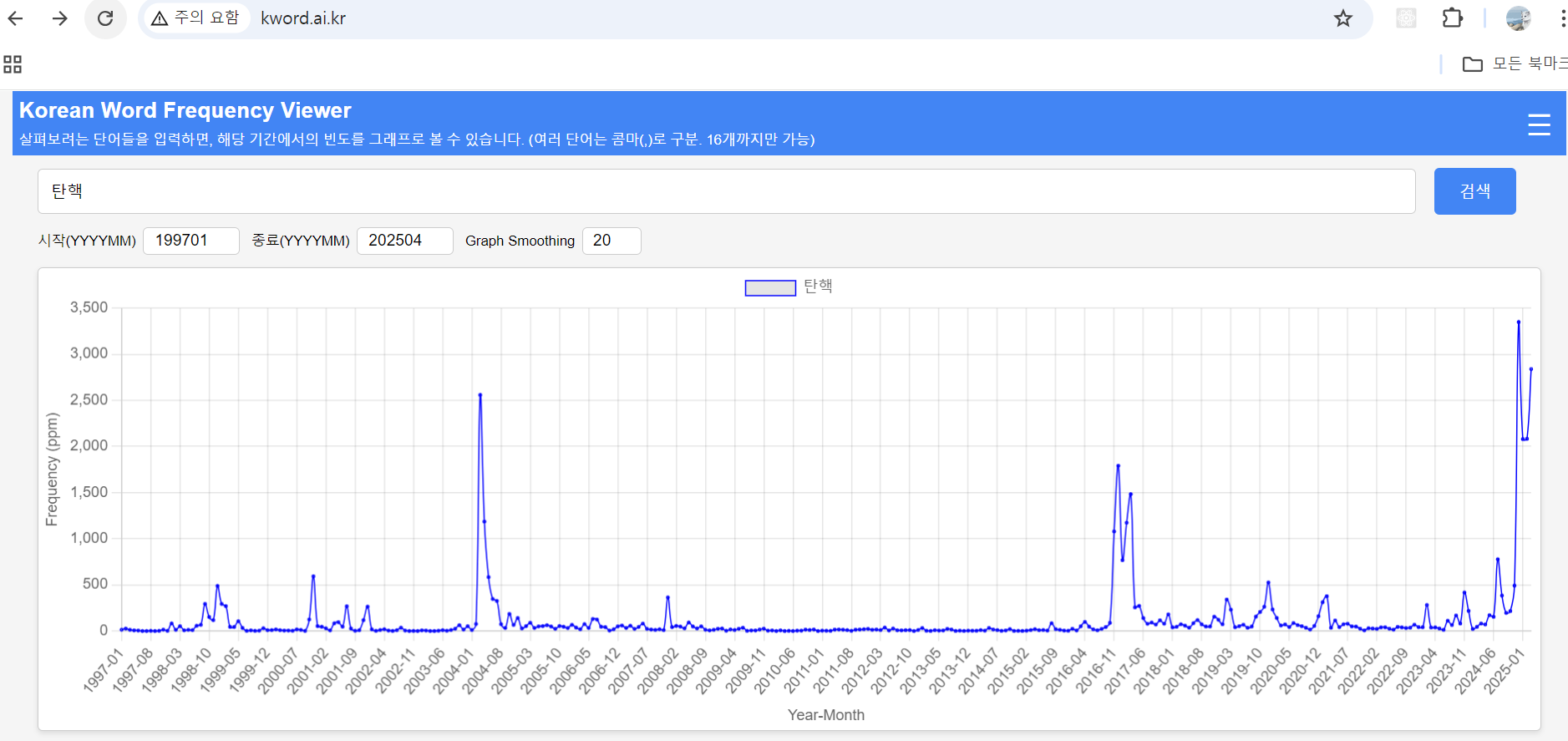 여튼, 구글 Ngram Viewer에서는 한글로 된 단어에 대한 그래프를 볼 수 없다. 그리고, 아직 아무 곳에서도 한글 단어에 대한 빈도율을 보여주는 사이트가 없다.