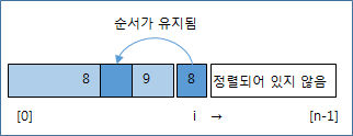 아래 그림처럼 오른쪽으로 이동하면서 삽입될 곳을 찾아서 들어가기에, 그 순서가 유지되고, 따라서, 안정적이라 할 수 있다.