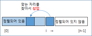 왼쪽에서 오른쪽으로 정렬해 나가는데, 대상이 되는 i 번째 수에 대해, 이미 정렬되어 있는 왼편의 어디에 삽입하면 되는지를 찾아서 집어넣고, i를 증가시키면서 오른편 끝까지 정렬해 나간다.
