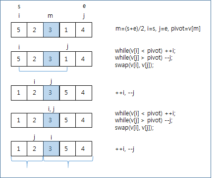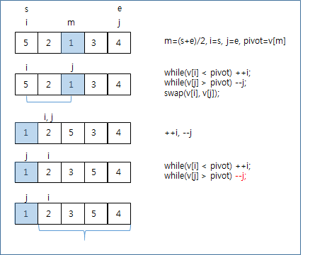그렇다면 왼 편은 \[s, j\]까지 오른 편은 \[i, e\]까지에 대해 다시 정렬을 하면 되는 것이다.