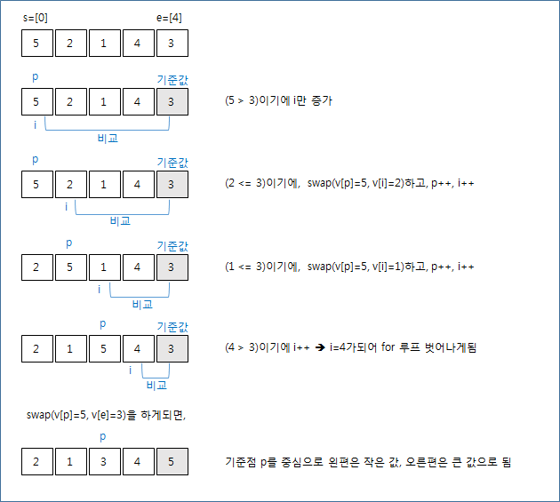 4. swap(v[p], v[e]) //기준점을 i위치로 이동